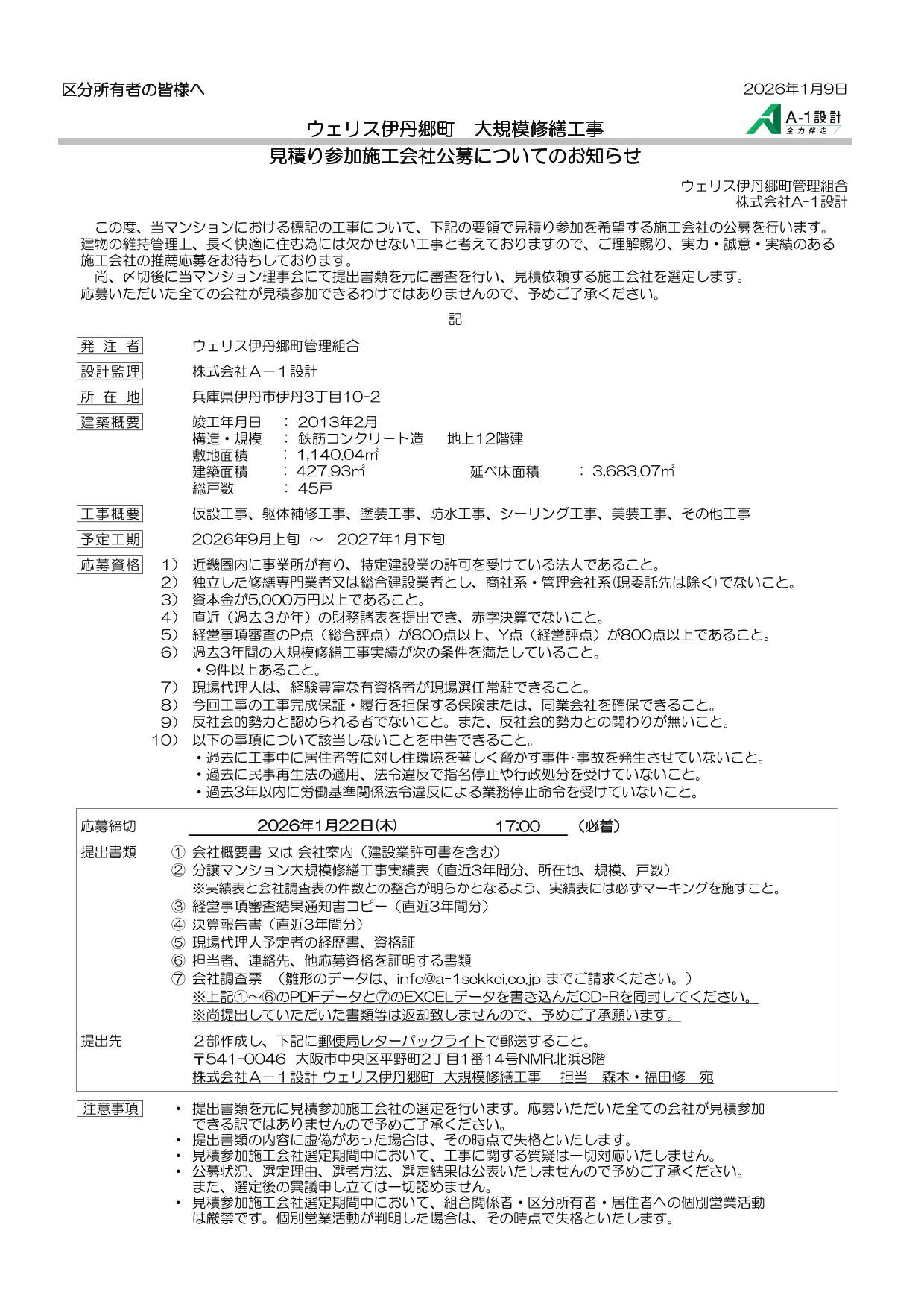 株式会社A-1設計 ウェリス伊丹郷町 大規模修繕工事  担当 森本・福田修 宛