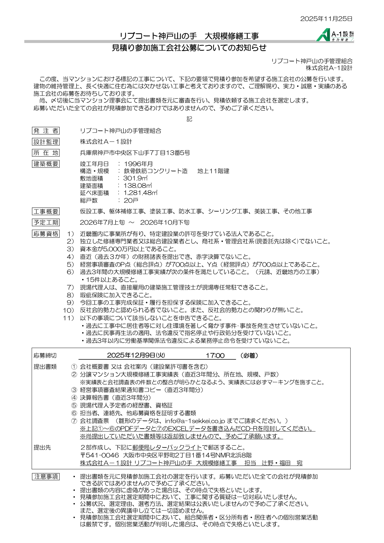 | 提出書類 | ①会社概要書 又は 会社案内(建設業許可書を含む) ②分譲マンション大規模修繕工事実績表(直近3年間分、所在地、規模、戸数) ※実績表と会社調査表の件数との整合が明らかとなるよう、実績表には必ずマーキングを施すこと。 ③経営事項審査結果通知書コピー(直近3年間分) ④決算報告書(直近3年間分) ⑤現場代理人予定者の経歴書、資格証 ⑥担当者、連絡先、他応募資格を証明する書類 ⑦会社調査票 (雛形のデータは、info@a-1sekkei.co.jp までご請求ください。) ※上記①~⑥のPDFデータと⑦のEXCELデータを書き込んだCD-Rを同封してください。 ※尚提出していただいた書類等は返却致しませんので、予めご了承願います。 |