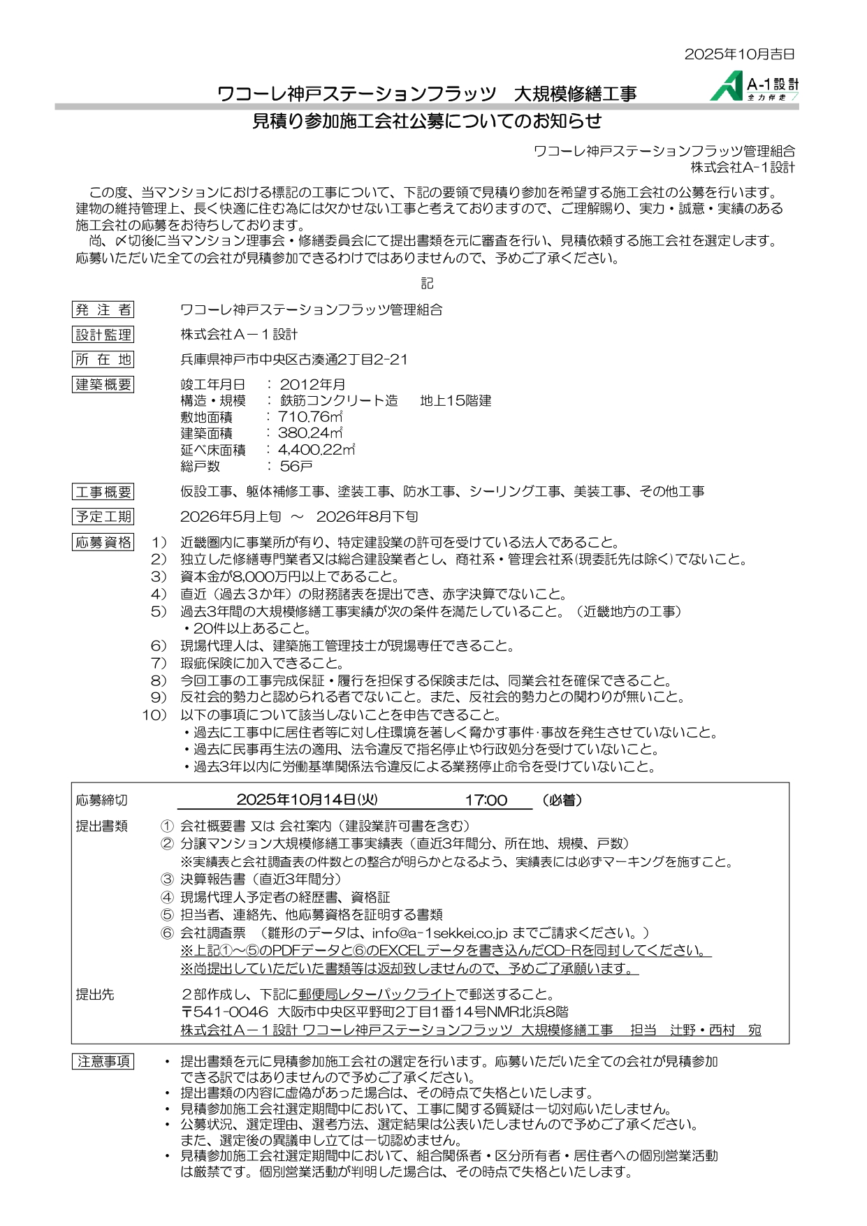 提出書類 | ①会社概要書 又は 会社案内(建設業許可書を含む) ②分譲マンション大規模修繕工事実績表(直近3年間分、所在地、規模、戸数) ※実績表と会社調査表の件数との整合が明らかとなるよう、実績表には必ずマーキングを施すこと。 ③決算報告書(直近3年間分) ④現場代理人予定者の経歴書、資格証 ⑤担当者、連絡先、他応募資格を証明する書類 ⑥会社調査票 (雛形のデータは、info@a-1sekkei.co.jp までご請求ください。) ※上記①~⑤のPDFデータと⑥のEXCELデータを書き込んだCD-Rを同封してください。 ※尚提出していただいた書類等は返却致しませんので、予めご了承願います。 |