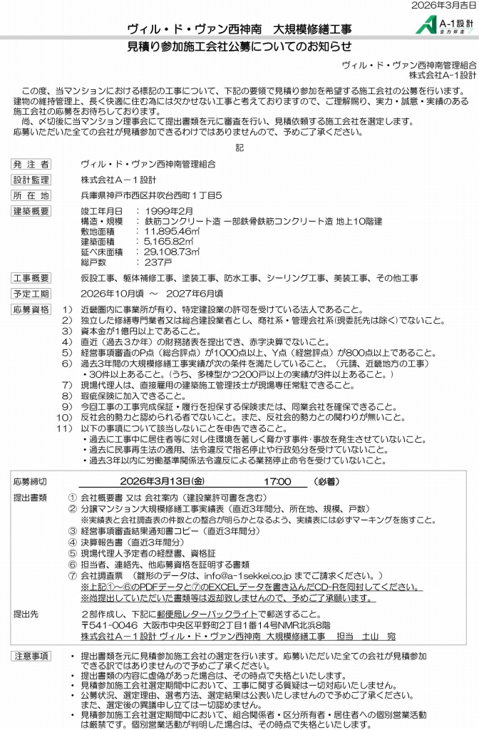 | 提出書類 | ① 会社概要書 又は 会社案内(建設業許可書を含む) ② 分譲マンション大規模修繕工事実績表(直近3年間分、所在地、規模、戸数) ※実績表と会社調査表の件数との整合が明らかとなるよう、実績表には必ずマーキングを施すこと。 ③ 経営事項審査結果通知書コピー(直近3年間分) ④ 決算報告書(直近3年間分) ⑤ 現場代理人予定者の経歴書、資格証 ⑥ 担当者、連絡先、他応募資格を証明する書類 ⑦ 会社調査票 (雛形のデータは、info@a-1sekkei.co.jp までご請求ください。) ※上記①~⑥のPDFデータと⑦のEXCELデータを書き込んだCD-Rを同封してください。 ※尚提出していただいた書類等は返却致しませんので、予めご了承願います。 |