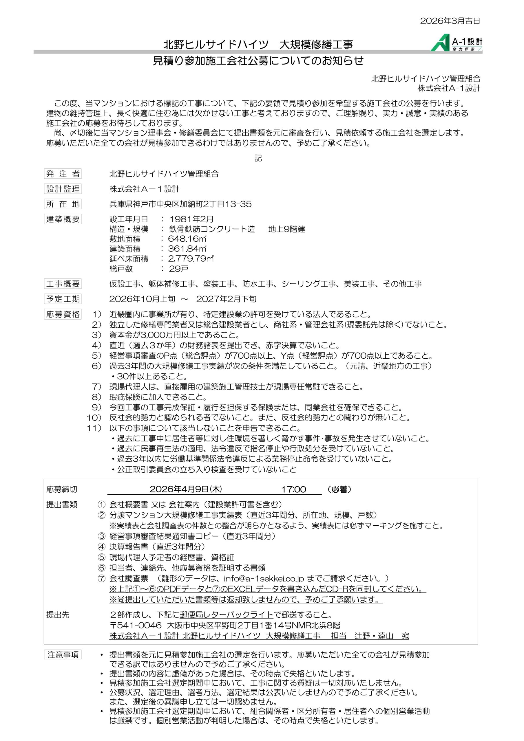 | 提出書類 | ① 会社概要書 又は 会社案内(建設業許可書を含む) ② 分譲マンション大規模修繕工事実績表(直近3年間分、所在地、規模、戸数) ※実績表と会社調査表の件数との整合が明らかとなるよう、実績表には必ずマーキングを施すこと。 ③ 経営事項審査結果通知書コピー(直近3年間分) ④ 決算報告書(直近3年間分) ⑤ 現場代理人予定者の経歴書、資格証 ⑥ 担当者、連絡先、他応募資格を証明する書類 ⑦ 会社調査票 (雛形のデータは、info@a-1sekkei.co.jp までご請求ください。) ※上記①~⑥のPDFデータと⑦のEXCELデータを書き込んだCD-Rを同封してください。 ※尚提出していただいた書類等は返却致しませんので、予めご了承願います。 |