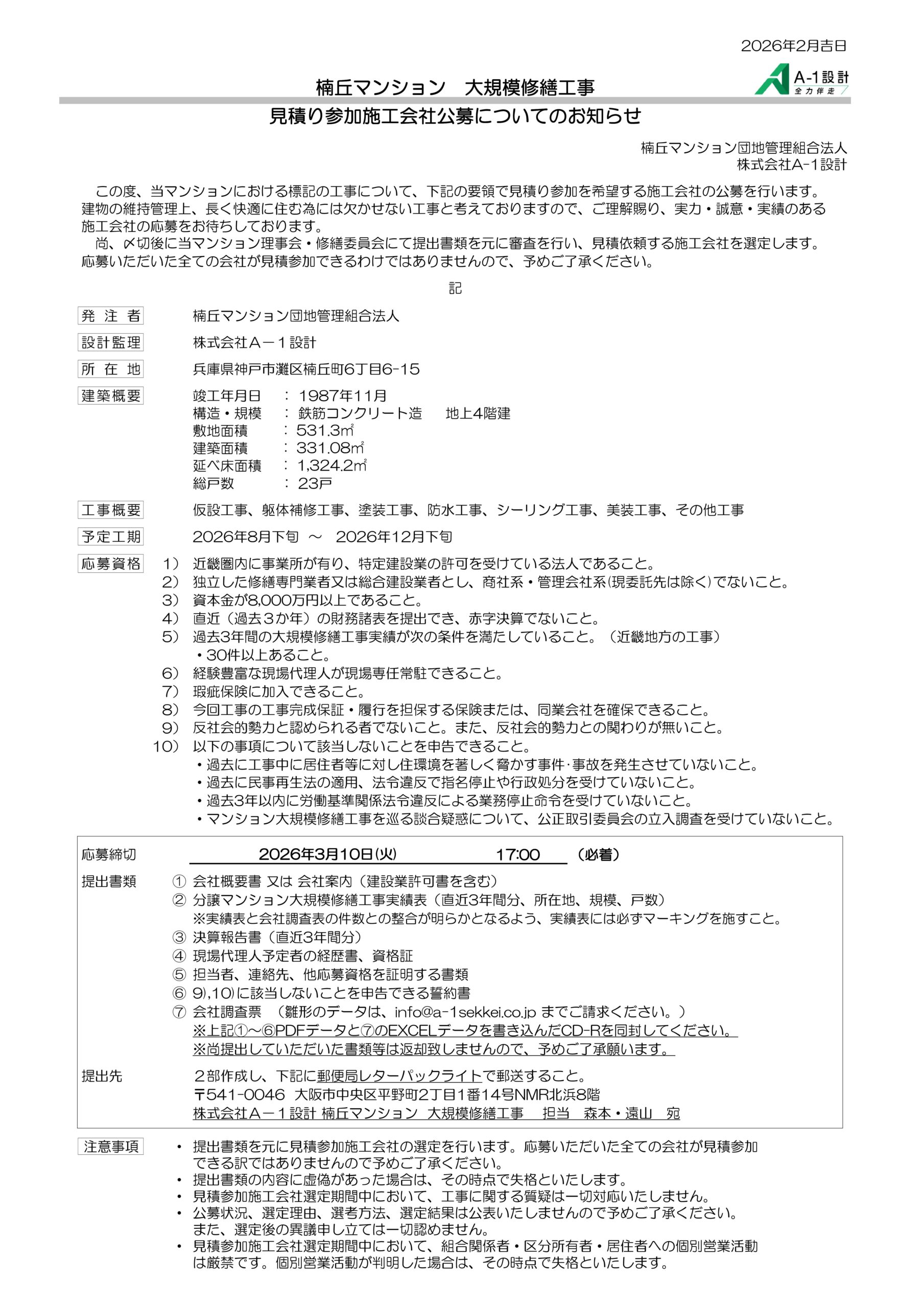 | 提出書類 | ① 会社概要書 又は 会社案内(建設業許可書を含む) ② 分譲マンション大規模修繕工事実績表(直近3年間分、所在地、規模、戸数) ※実績表と会社調査表の件数との整合が明らかとなるよう、実績表には必ずマーキングを施すこと。 ③ 決算報告書(直近3年間分) ④ 現場代理人予定者の経歴書、資格証 ⑤ 担当者、連絡先、他応募資格を証明する書類 ⑥ 9),10)に該当しないことを申告できる誓約書 ⑦ 会社調査票 (雛形のデータは、info@a-1sekkei.co.jp までご請求ください。) ※上記①~⑥PDFデータと⑦のEXCELデータを書き込んだCD-Rを同封してください。 ※尚提出していただいた書類等は返却致しませんので、予めご了承願います。 |