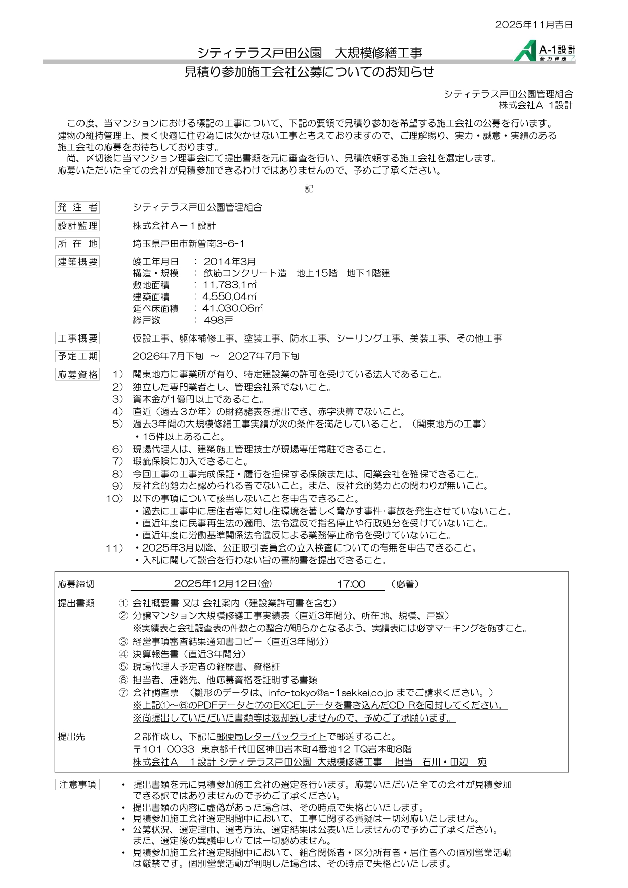 | 応募資格 | 1) 関東地方に事業所が有り、特定建設業の許可を受けている法人であること。 2) 独立した専門業者とし、管理会社系でないこと。 3) 資本金が1億円以上であること。 4) 直近(過去3か年)の財務諸表を提出でき、赤字決算でないこと。 5) 過去3年間の大規模修繕工事実績が次の条件を満たしていること。(関東地方の工事) ・15件以上あること。 6) 現場代理人は、建築施工管理技士が現場専任常駐できること。 7) 瑕疵保険に加入できること。 8) 今回工事の工事完成保証・履行を担保する保険または、同業会社を確保できること。 9)反社会的勢力と認められる者でないこと。また、反社会的勢力との関わりが無いこと。 10) 以下の事項について該当しないことを申告できること。 ・過去に工事中に居住者等に対し住環境を著しく脅かす事件・事故を発生させていないこと。・直近年度に民事再生法の適用、法令違反で指名停止や行政処分を受けていないこと。 ・直近年度に労働基準関係法令違反による業務停止命令を受けていないこと。 11)・2025年3月以降、公正取引委員会の立入検査についての有無を申告できること。 |