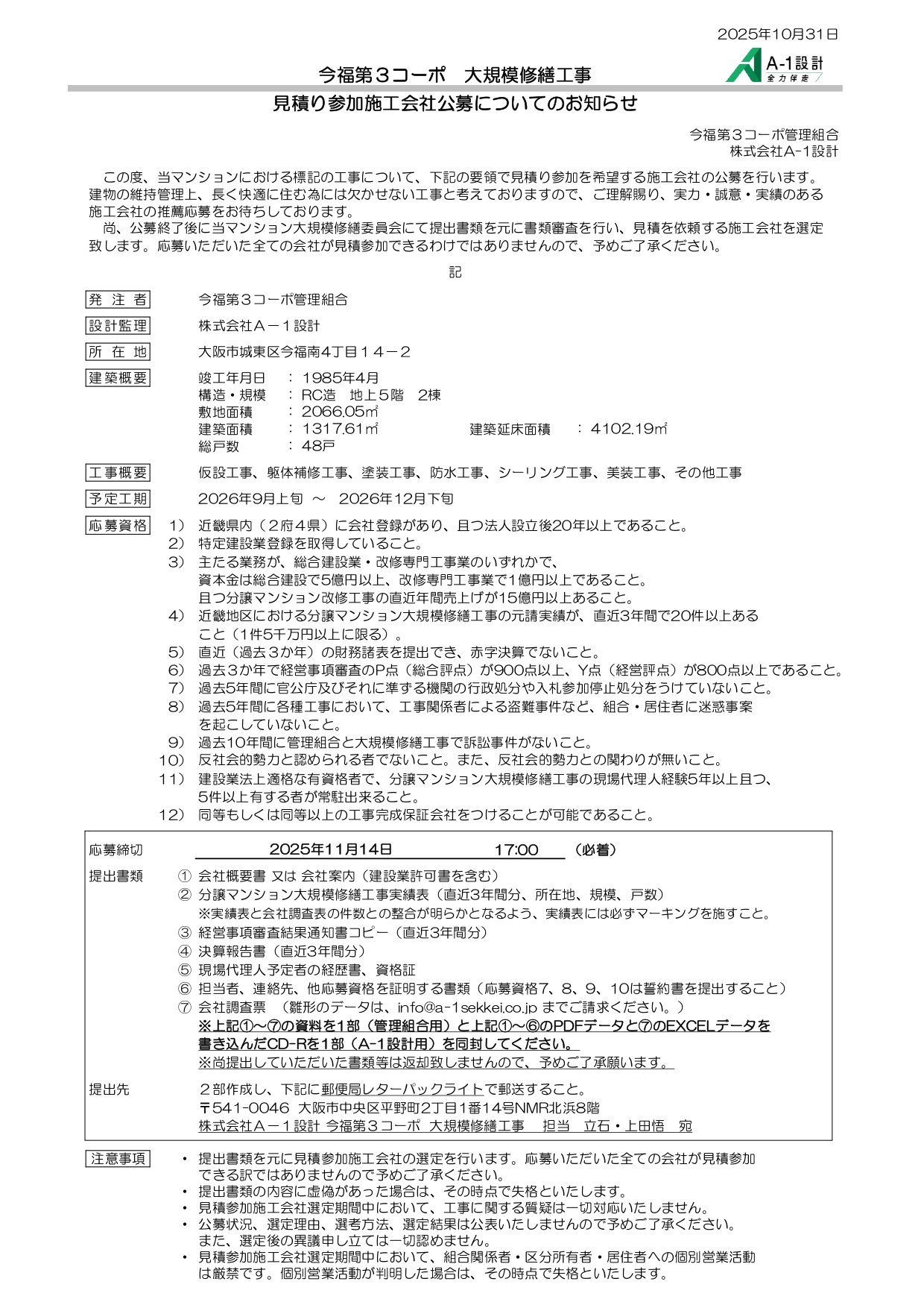 | 応募資格 | 1)近畿県内(2府4県)に会社登録があり、且つ法人設立後20年以上であること。 2)特定建設業登録を取得していること。 3)主たる業務が、総合建設業・改修専門工事業のいずれかで、 資本金は総合建設で5億円以上、改修専門工事業で1億円以上であること。 且つ分譲マンション改修工事の直近年間売上げが15億円以上あること。 4)近畿地区における分譲マンション大規模修繕工事の元請実績が、直近3年間で20件以上あること。(1件5千万円以上に限る) 5)直近(過去3か年)の財務諸表を提出でき、赤字決算でないこと。 6)過去3か年で経営事項審査のP点(総合評点)が900点以上、Y点(経営評点)が800点以上であること。 7)過去5年間に官公庁及びそれに準ずる機関の行政処分や入札参加停止処分をうけていないこと。 8)過去5年間に各種工事において、工事関係者による盗難事件など、組合・居住者に迷惑事案を起こしていないこと。 9)過去10年間に管理組合と大規模修繕工事で訴訟事件がないこと。 10)反社会的勢力と認められる者でないこと。また、反社会的勢力との関わりが無いこと。 11)建設業法上適格な有資格者で、分譲マンション大規模修繕工事の現場代理人経験5年以上且つ、5件以上有する者が常駐出来ること。 12)同等もしくは同等以上の工事完成保証会社をつけることが可能であること。 |