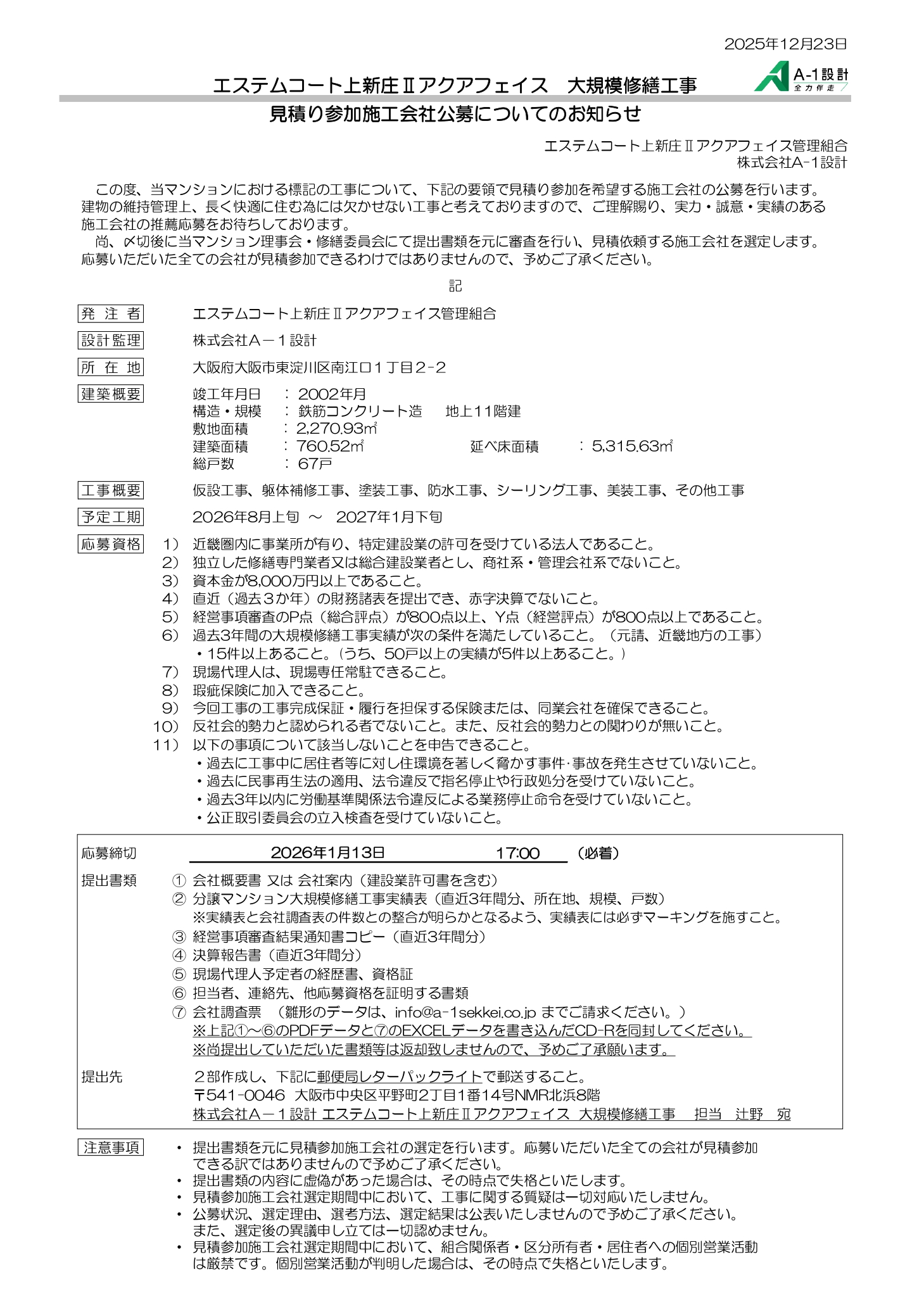 | 提出書類 | ①会社概要書 又は 会社案内(建設業許可書を含む) ②分譲マンション大規模修繕工事実績表(直近3年間分、所在地、規模、戸数) ※実績表と会社調査表の件数との整合が明らかとなるよう、実績表には必ずマーキングを施すこと。 ③経営事項審査結果通知書コピー(直近3年間分) ④決算報告書(直近3年間分) ⑤現場代理人予定者の経歴書、資格証 ⑥担当者、連絡先、他応募資格を証明する書類 ⑦会社調査票 (雛形のデータは、info@a-1sekkei.co.jp までご請求ください。) ※上記①~⑥のPDFデータと⑦のEXCELデータを書き込んだCD-Rを同封してください。 ※尚提出していただいた書類等は返却致しませんので、予めご了承願います。 |