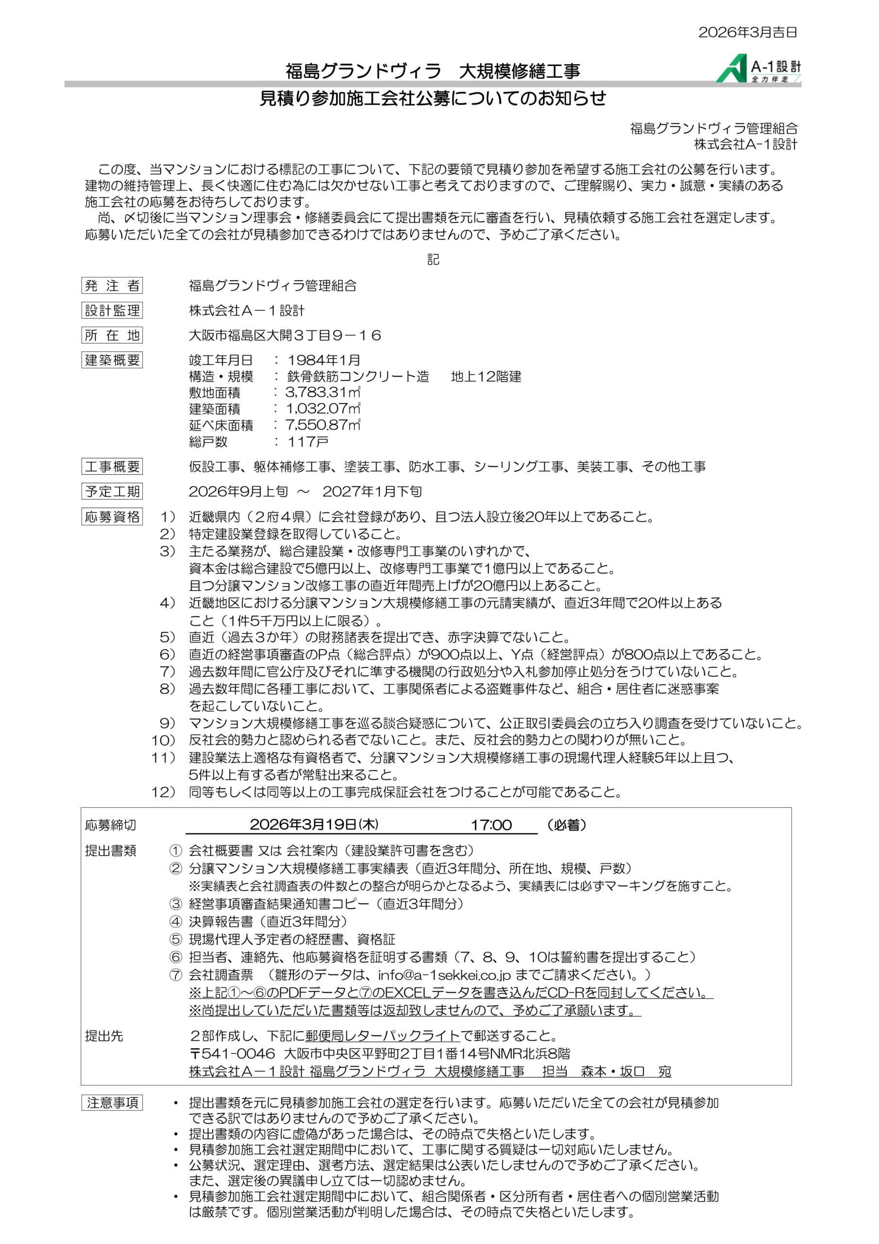 株式会社A-1設計 福島グランドヴィラ 大規模修繕工事  担当 森本・坂口 宛
