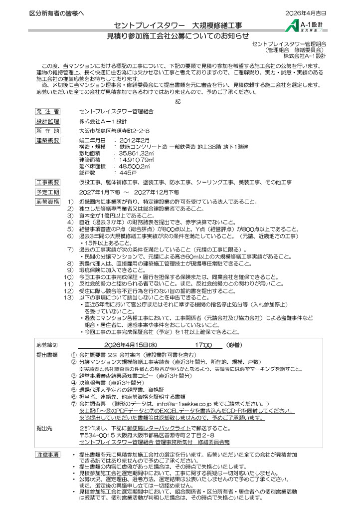 | 提出先 | 2部作成し、下記に郵便局レターパックライトで郵送すること。 〒534-0015 大阪府大阪市都島区善源寺町2丁目2−8 セントプレイスタワー管理組合 管理事務所気付 修繕委員会宛 |