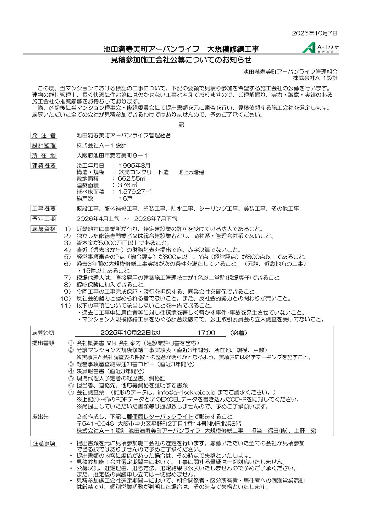 応募資格 | 1)近畿地方に事業所が有り、特定建設業の許可を受けている法人であること。 2)独立した修繕専門業者又は総合建設業者とし、商社系・管理会社系でないこと。 3)資本金が5,000万円以上であること。 4)直近(過去3か年)の財務諸表を提出でき、赤字決算でないこと。 5)経営事項審査のP点(総合評点)が800点以上、Y点(経営評点)が800点以上であること。 6)過去3年間の大規模修繕工事実績が次の条件を満たしていること。(元請、近畿地方の工事) ・15件以上あること。 7)現場代理人は、直接雇用の建築施工管理技士が1名以上常駐(現場専任)できること。 8)瑕疵保険に加入できること。 9)今回工事の工事完成保証・履行を担保する、同業会社を確保できること。 10)反社会的勢力と認められる者でないこと。また、反社会的勢力との関わりが無いこと。 11)以下の事項について該当しないことを申告できること。 ・過去に工事中に居住者等に対し住環境を著しく脅かす事件・事故を発生させていないこと。 ・マンション大規模修繕工事をめぐる談合疑惑にて、公正取引委員会の立入調査を受けてないこと。 |