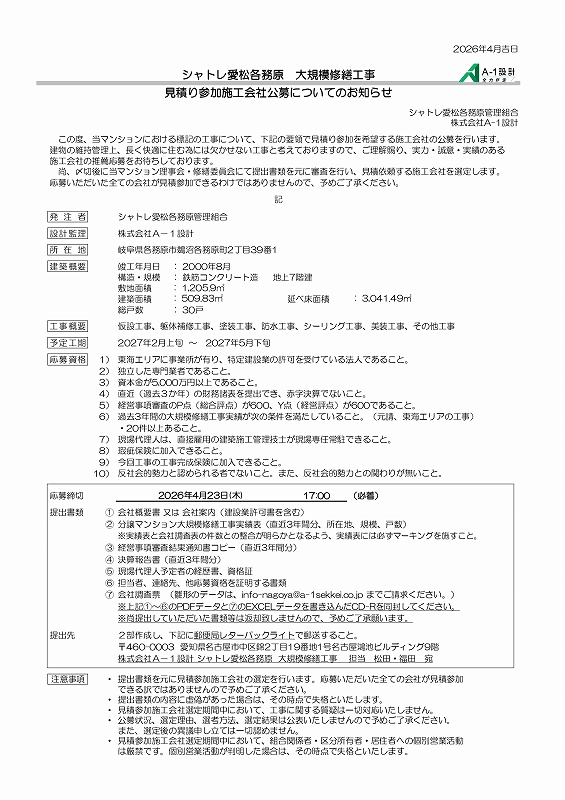 株式会社A-1設計 シャトレ愛松各務原 大規模修繕工事  担当 松田・福田 宛