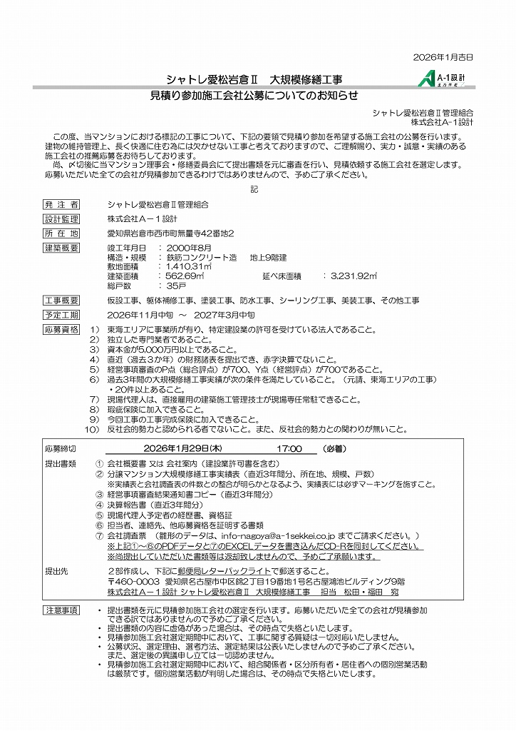 | 提出書類 | ①会社概要書 又は 会社案内(建設業許可書を含む) ②分譲マンション大規模修繕工事実績表(直近3年間分、所在地、規模、戸数) ※実績表と会社調査表の件数との整合が明らかとなるよう、実績表には必ずマーキングを施すこと。 ③経営事項審査結果通知書コピー(直近3年間分) ④決算報告書(直近3年間分) ⑤現場代理人予定者の経歴書、資格証 ⑥担当者、連絡先、他応募資格を証明する書類 ⑦会社調査票 (雛形のデータは、info-nagoya@a-1sekkei.co.jp までご請求ください。) ※上記①~⑥のPDFデータと⑦のEXCELデータを書き込んだCD-Rを同封してください。 ※尚提出していただいた書類等は返却致しませんので、予めご了承願います。 |