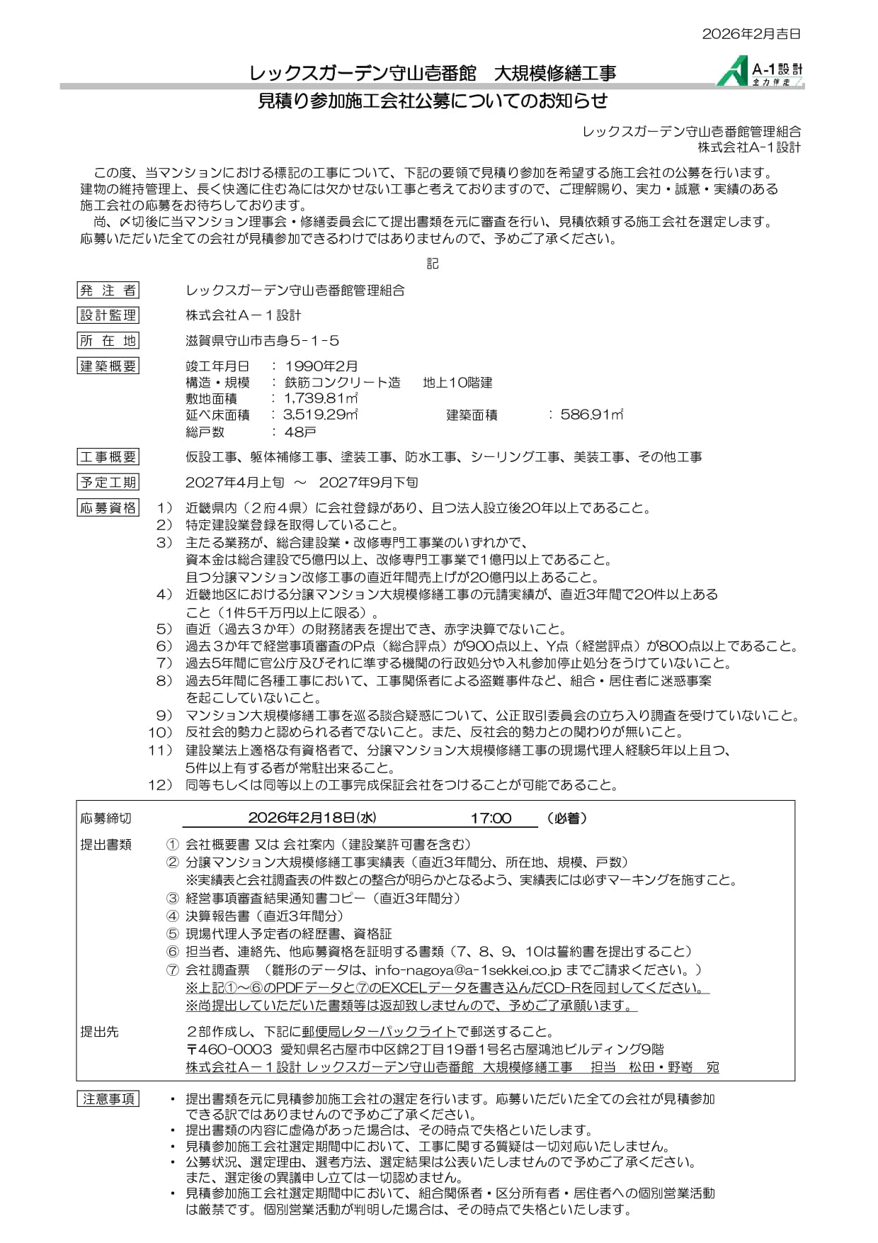 【滋賀県守山市】レックスガーデン守山壱番館 施工業者募集
