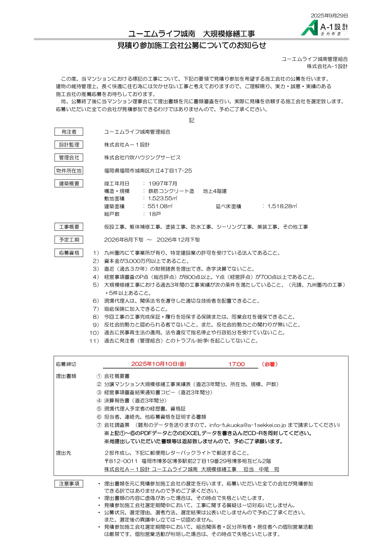 提出書類 | ①会社概要書 ②分譲マンション大規模修繕工事実績表(直近3年間分、所在地、規模、戸数) ③経営事項審査結果通知書コピー(直近3年間分) ④決算報告書(直近3年間分) ⑤現場代理人予定者の経歴書、資格証 ⑥担当者、連絡先、他応募資格を証明する書類 ⑦会社調査票 (雛形のデータを送りますので、info-fukuoka@a-1sekkei.co.jp まで請求してください) ※上記①~⑥のPDFデータと⑦のEXCELデータを書き込んだCD-Rを同封してください。 ※尚提出していただいた書類等は返却致しませんので、予めご了承願います。 |