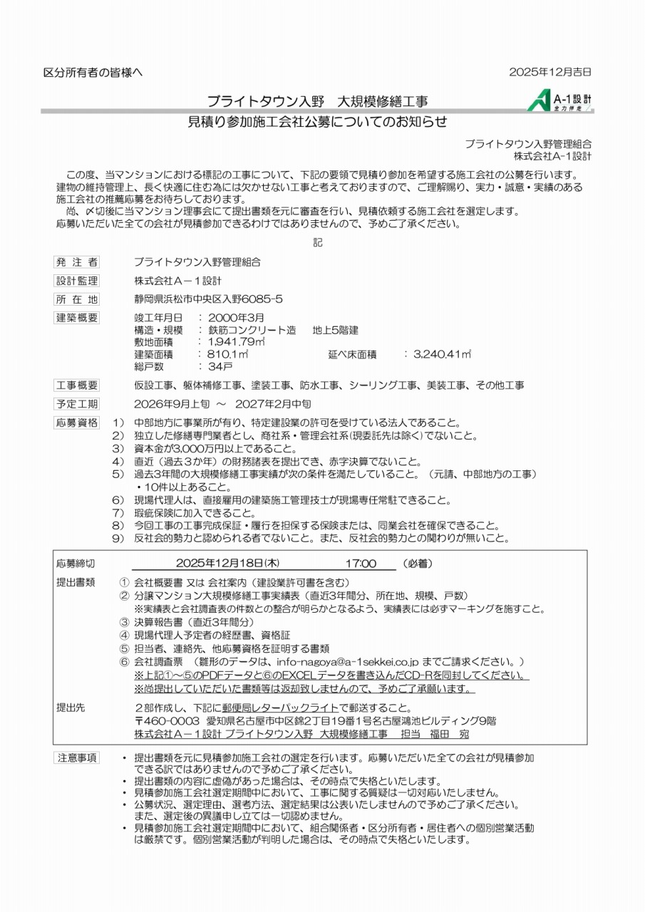 | 提出書類 | ① 会社概要書 又は 会社案内(建設業許可書を含む) ② 分譲マンション大規模修繕工事実績表(直近3年間分、所在地、規模、戸数) ※実績表と会社調査表の件数との整合が明らかとなるよう、実績表には必ずマーキングを施すこと。 ③ 決算報告書(直近3年間分) ④ 現場代理人予定者の経歴書、資格証 ⑤ 担当者、連絡先、他応募資格を証明する書類 ⑥ 会社調査票 (雛形のデータは、info-nagoya@a-1sekkei.co.jp までご請求ください。) ※上記①~⑤のPDFデータと⑥のEXCELデータを書き込んだCD-Rを同封してください。 ※尚提出していただいた書類等は返却致しませんので、予めご了承願います。 |